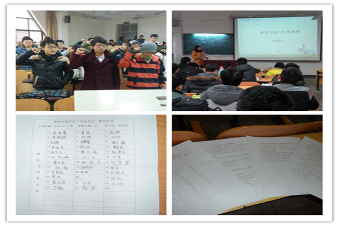 全院广泛积极开展关于考风考纪的自律教育活动,各班级通过诚信标语比赛、知识竞赛等多种活动形式开展主题教育,组织学生集体宣读“诚信考试承诺书”,在“诚信考试签名表”上签字以表决心。深入开展的考风考纪教育活动,对引导学生端正考试态度,踏实诚信应试,努力营造一个“倡导诚信考试·杜绝违纪作弊”的良好氛围有重要意义。