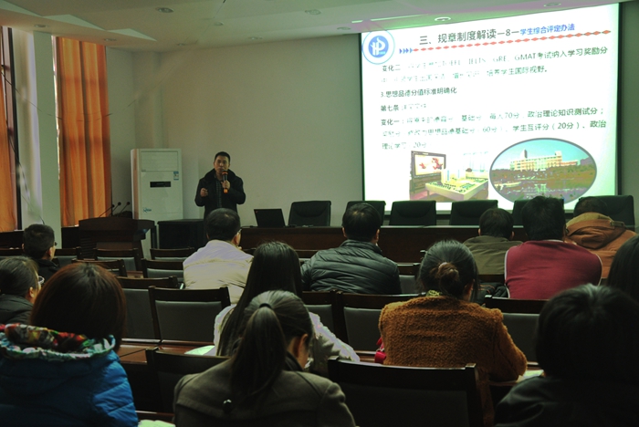 12月23日下午,该院在学院一楼学术报告厅举行全体专兼职辅导员、班主任专题培训会,该院党委副书记张明带领大家再次系统地学习了系列学校学生教育管理规章制度。他就《河南理工大学辅导员工作条例及考核办法》《河南理工大学班主任工作条例及考核办法》《河南理工大学班级干部选任与管理细则》等文件进行了深入解读。为保证教育管理规章制定的贯彻落实,张明向全体辅导员、班主任提出三点要求,一是与会人员要高度重视,做到知程序、懂政策,并将系列学生教育管理规章制度精神和内容传达给同学们;二是采取适当的方式方法,认真开展班级工作;三是端正态度,要用心、爱心、细心、多心的做好学生工作,贴近学生、贴近生活、贴近实际。