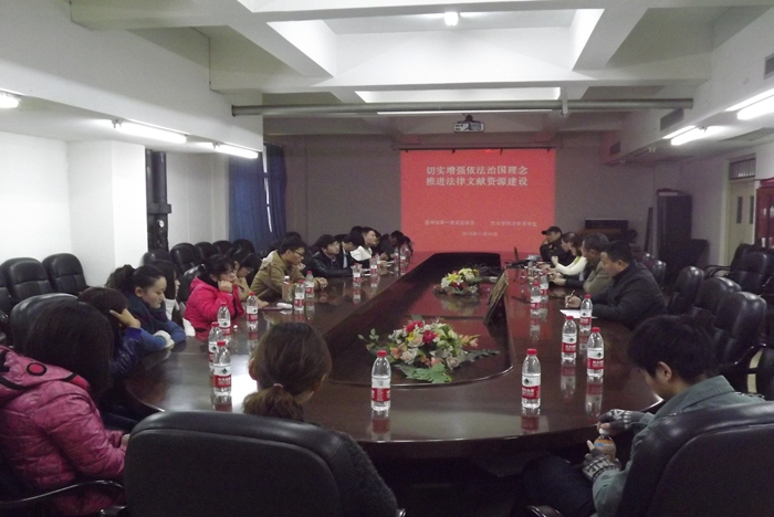 会议围绕2个议题展开,一是图书馆职工与法学专业学生对“依法治国”问题进行探讨;二是征集学生对图书馆法律文献资源建设、服务与管理等方面的意见。