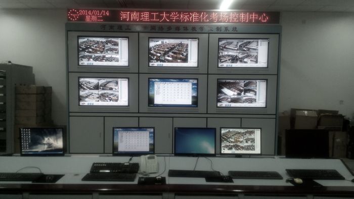 根据《河南省教育厅关于转发教育部关于做好国家教育考试标准化考点建设工作的通知》(教招办〔2012〕94号)的精神,我校于2013年9月完成了标准化考场的建设工作。共建设有视频监考室、巡查指挥中心及357个标准化考场,所有考场视频均可以通过网络终端被传达至主控中心,巡视人员可以任意调取某一考场,通过视频监控查看监考教师履行监考工作、查看考生考试纪律等情况,并且标准化考场有自动屏蔽功能,考试期间所有考场通讯设备信号将被中断。标准化考场的建设推进了学校考试工作的规范化,为学校营造了良好的考试环境。