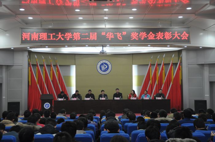 典礼在雄壮的国歌声中拉开帷幕。赵辉简要介绍了华飞公司及“华飞奖学金”的基本情况。张福贵宣读了《河南理工大学华飞奖学金评定办法》,付子义宣读《第二届“华飞杯”奖学金获得者的决定》和获奖学生名单。本届共有34名学生获得“华飞奖学金”,其中一等奖3名,二等奖9名,三等奖13名,鼓励奖9名。与会领导和嘉宾为获奖学生依次颁发获奖证书和奖金。