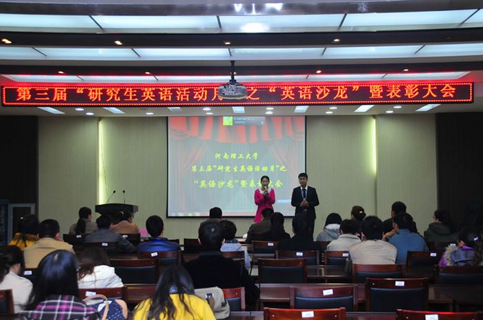11月16日晚,由研究生工作部(处)主办、研究生英语俱乐部承办的第三届“研究生英语活动月”之“英语沙龙”暨活动月总结表彰大会在计算机学院201报告厅顺利举行。研究生工作部(处)部(处)长赵同谦、研究生工作部副部长王伟超出席活动,研究生思想教育科相关老师、外国语学院评委老师代表、各项比赛获奖选手和研究生英语俱乐部全部成员参加会议。