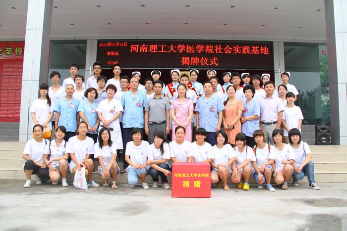 7月19日下午,我校医学院社会实践基地揭牌仪式在河南省第二慈善医院举行。河南理工大学团委书记王婕、医学院副院长李培富、慈善医院副院长王建国、副院长谢晓红等相关负责同志以及医学院实践团队员参加了揭牌仪式。