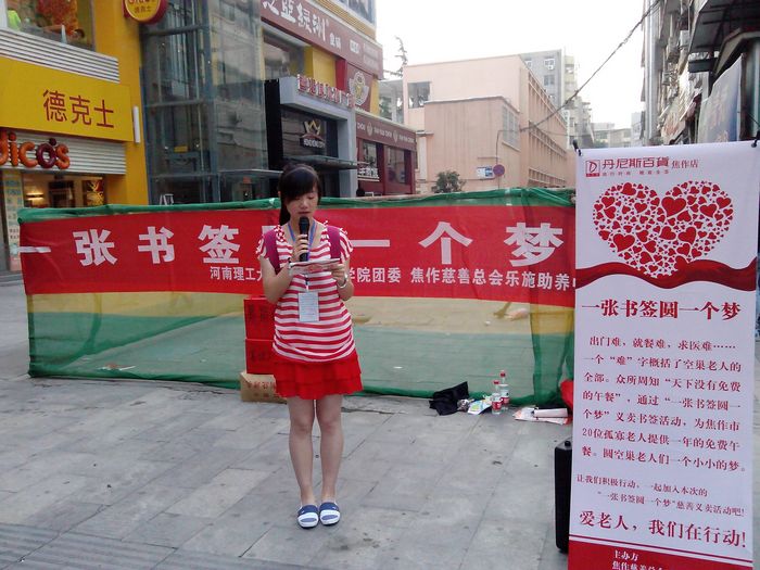 义卖活动分别在河南理工大学、滨河花园小区、龙源湖广场、丹尼斯商场及人民公园等地开展。“购买一张书签,献出一份爱心;一个小小的举动,温暖无数孤寡老人;您将爱奉献,温暖和幸福也会在您心中绽放!”这是队员们的口号。简单的一句话在这一天里被他们重复了无数遍,为的只是让更多的人了解本次活动的目的与意义,以便参与到活动中来。孤寡老人的那一双双无助的手,那一张张年迈的脸,那一道道渴望的目光,正呼唤着人间的真情,每多卖出一张书签就意味着多一份实现老人们安享晚年的梦想。实践队员用心地卖着每一张书签,个人的力量是微薄的,但随着越来越多的市民的参与,他们爱心接力棒会不断地传递下去。