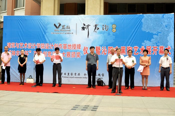 张战营为蓝钻文化产业有限公司授牌,标志我校在蓝钻文化有限公司的黑陶设计创作基地启动仪式正式启动。参加活动的各位领导为“神农陶杯”茶具创意设计大赛中获奖的学生进行颁奖。最后,买国宣布沁阳市黑陶艺术展正式开幕。