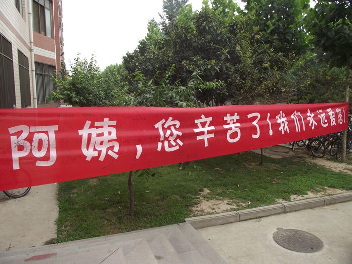学生宿舍楼门前悬挂着一条鲜红色条幅,“阿姨,您辛苦了!我们永远爱您”几个大字赫然入目,条幅上面还签满了学生们的留言,表达着毕业生对宿管阿姨难舍的离别之情……