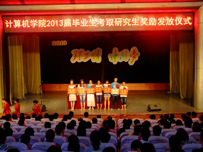 为激发学生考研积极性,提高学生培养质量,促进优良学风形成,6月19日下午,计算机学院在小礼堂举办2013届毕业生考取研究生奖励发放仪式。该院党委书记王全才、学生部(处)副部(处)长许荣梅、该院党委副书记许辉、副院长张长森及获得奖励学生代表、低年级学生代表近800人参加了发放仪式。