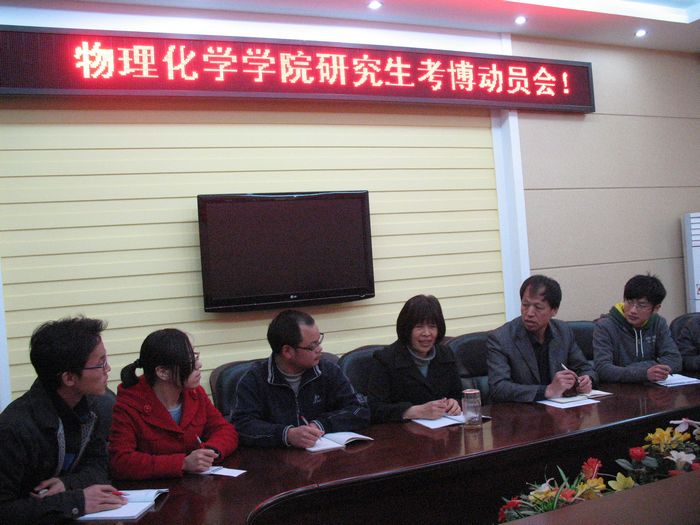 会议伊始,王丙新简单介绍了了10级同学的考博情况,针对理化学院目前的考博趋势,向全体研究生讲述了考博的意义,他说,博士阶段的学习可以进一步丰富自己的知识结构,同时也能带来更宽阔的眼界,增加就业机会,实现更高的人生价值。其次,他还通过对比博士生、硕士生以及本科生毕业后工作岗位、工资待遇、发展空间的差别来明确考博的重要性和必要性。针对一些同学打算就业后再考博的想法给出了自己的看法。他说,就业后再读博的可能性很小,主要是受时间、工作环境和社会各种压力的限制,因此他希望广大研究生根据自身的实际情况,确定目标,认真准备,积极报考博士研究生。随后,缪娟也指出硕士研究生需要考博的原因有三个:第一、丰富知识结构,提高综合素质;第二,增加就业机会,提升个人发展空间;第三,树立理想信念,实现更高人生价值。考博要有一种动力,坚定理想,严格要求自己,实现更高人生梦想。
