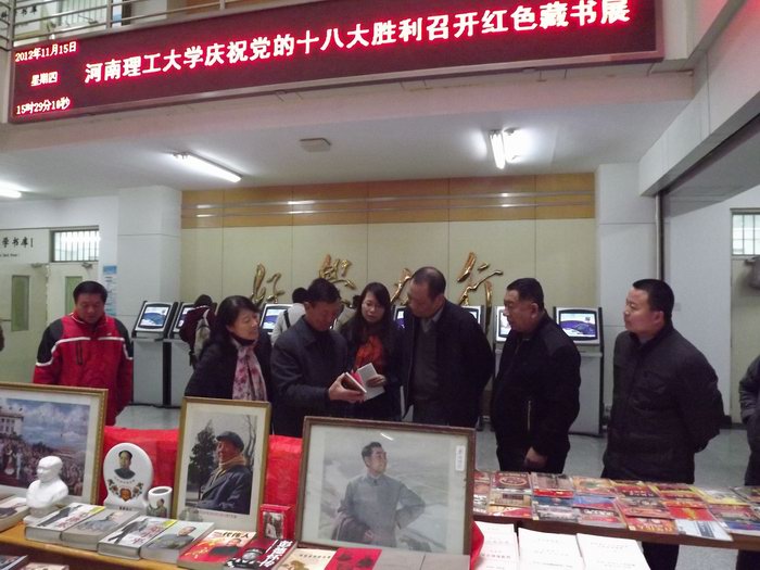 11月15日,图书馆党员在图书馆党总支副书记张如意的带领下,在图书馆二楼大厅开展了主题为“感受红色书展 坚定理想信念”的党日活动,通过观看红色藏书展,共庆党的十八大成功召开。