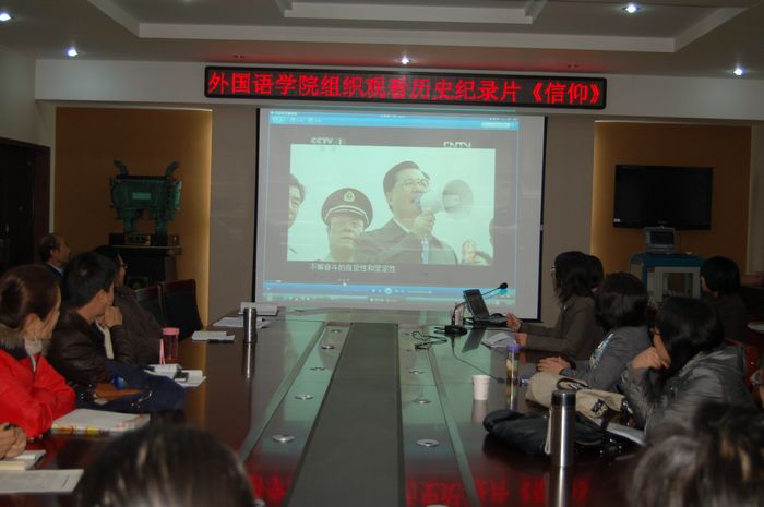 11月20日下午,外国语学院党委组织全体教职工集中观看了由中共中央组织部、中共中央文献研究室、中共中央党史研究室、中央电视台联合摄制的历史文献纪录片《信仰》。