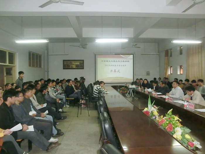 10月16日下午,土木工程学院2012年研究生学术文化节开幕式在土木工程学院会议室举行。校研究生处处长、研究生工作部部长赵同谦,研究生工作部副部长王伟超;土木工程学院党委书记朱天明,院长刘希亮,党委副书记张明,副院长王有凯、梁为民、余永强等参加了会议,该院各相关部门负责人及全体研究生参加了此次会议。会议由副院长余永强主持。