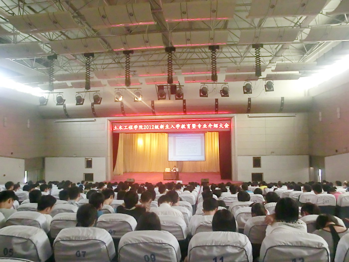 为使2012级新生更好的了解学院专业设置、尽快的适应并融入大学生活,9月9日上午,土木工程学院在我校南校区小礼堂召开2012级新生入学教育暨专业介绍大会。该院党委书记朱天明、院长刘希亮、党委副书记张明、副院长王有凯、梁为民、余永强以及各系室(科室)主任、2012级辅导员和班主任出席了此次会议。会议由张明主持。