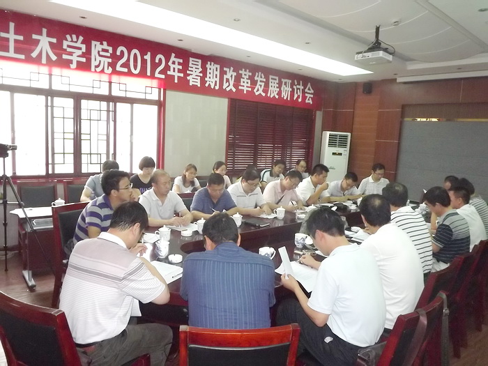 为了深入贯彻落实土木工程学院“十二五”发展规划和第三次党代会精神,探索新思路,共谋新发展,7月10日,土木工程学院在焦作市穆家寨生态旅游度假酒店隆重召开改革发展研讨会。全体院领导、各科室负责人、系(室)主任、教工党支部书记及部分教授和党外人士代表共28人参加了会议。会议由院党委书记朱天明主持。