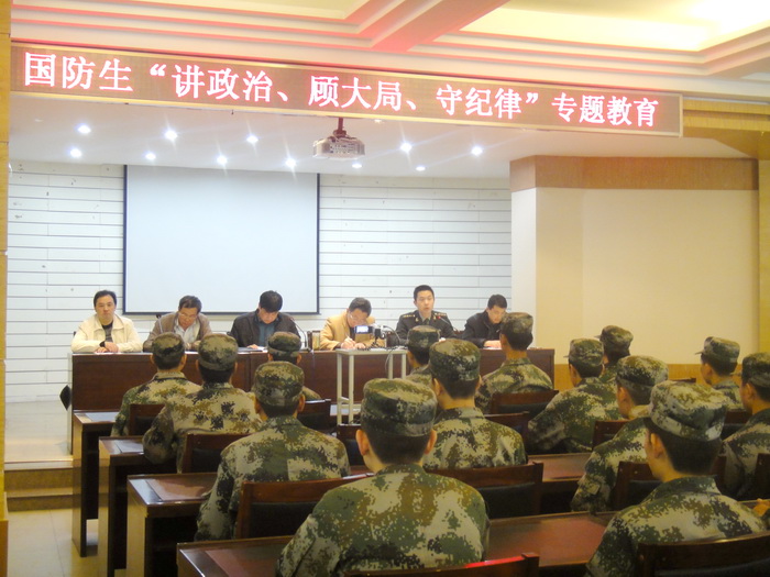 为培养国防生讲政治守纪律的意识,深化国防生思想政治教育,近日,后备军官学院在大学生招聘中心会议室召开国防生“讲政治、顾大局、守纪律”专题教育会。该院院长芦保宏、院党委副书记王立东等学院领导和老师参加会议,全体国防生到场聆听。