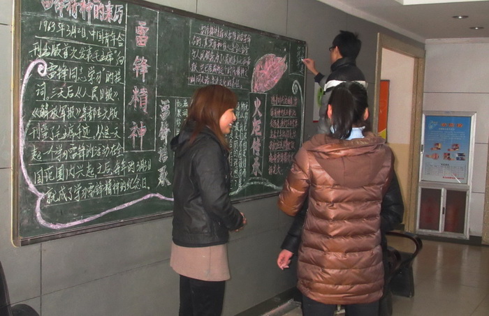 3月4日早上八点,同学们带着工具、图书资料等分组有序地进入各个学生宿舍楼。同学们以饱满的热情和谦逊的态度投入到这次活动中,做到分工明确,有负责版画设计的,有负责文字采集和编辑的,充分发挥专业特长。板报内容主要涉及雷锋简介、雷锋语录、雷锋精神的时代含义和当代大学生的社会责任。活动过程中不时有同学驻足观看、感受和学习雷锋,也有的同学和活动人员交流关于雷锋的英勇事迹和雷锋的精神。经过同学们4个多小时的努力,最后一张张设计精美、内容充实的板报呈现在大家面前。