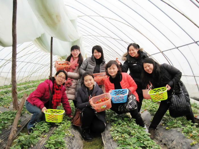 为迎接三八妇女节的到来,3月3日,计算机学院组织女教工们到草莓采摘园采摘草莓。下午3点,在一片热热闹闹的气氛中,计算机女教工们一人骑一辆单车,在料峭的寒风中出发了。浩荡的车阵载着老师们的愉快心情,在道路上编织成了一条别致的风景。10分钟的车程,女教师们到达了目的地—奶油草莓采摘园。一进种植大棚,大家就被眼前的景象吸引了:在黑黑的泥土上,有着满视野的绿色的叶,在绿色的叶中间,藏着一颗颗红彤彤的草莓!来不及休息一下,大家都迫不及待弯下腰,兴致勃勃的采摘起了草莓。一颗、两颗、三颗…..红红的草莓被满满的收获在大家的篮子里,在一片香甜的草莓香气中,快乐也被收获在了大家心间。活动尾声,大家提着沉沉的草莓篮,用幸福的笑容在镜头中留下了一份美好的回忆。