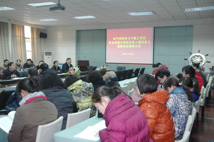 为传达学习省委书记、省人大常委会主任卢展工同志在与全省部分高校负责人座谈会上的重要讲话,12月20日下午,电气学院在电气楼101室召开深入学习卢展工书记重要讲话精神大会。电气学院党委书记康全玉、院长余发山、党委副书记王少华、副院长汪旭东、王福忠、郑征以及全体教职工参加了此次会议。会议由院党委副书记王少华主持。
