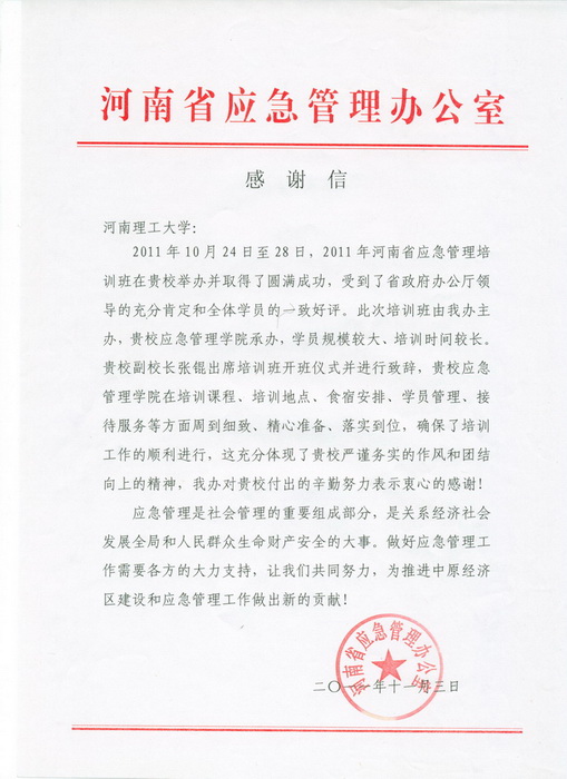 近日,我校收到河南省应急管理办公室发来的感谢信,感谢我校为2011年全省应急管理培训班成功举办做出的贡献。感谢信如下。