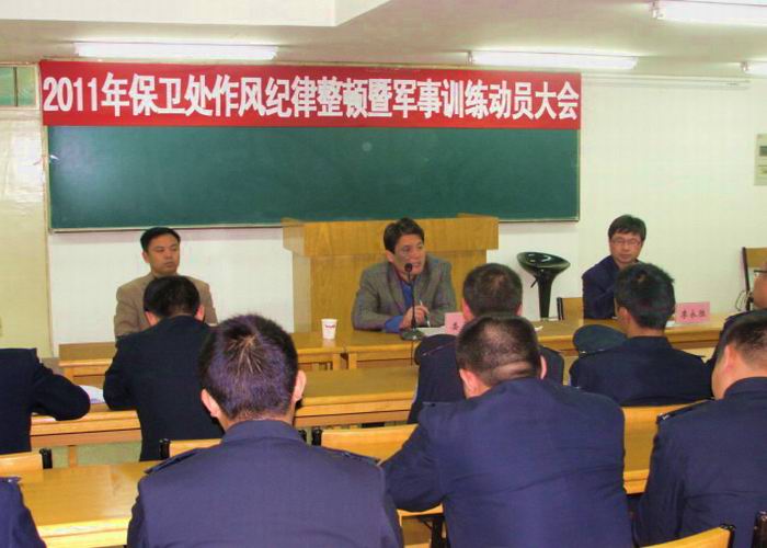 为创建文明服务窗口单位,扎实做好教育和整顿工作,10月25日保卫处专门召开了全体保卫人员动员大会,详细安排布置了有关工作。几天来,处领导和全体校卫队员从早上7:30到9:00在学校南门进行有关内容的训练,下一步处领导还要对全体校卫队员进行法规学习、业务培训和礼仪讲座等系列活动。
