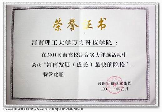 日前,从“给力中原经济区建设•河南高校教育改革发展高峰论坛”会议上传来喜讯,万方学院在“2011河南高校综合实力大型调查评选”活动中脱颖而出,荣获“河南发展(成长)最快的院校”称号。