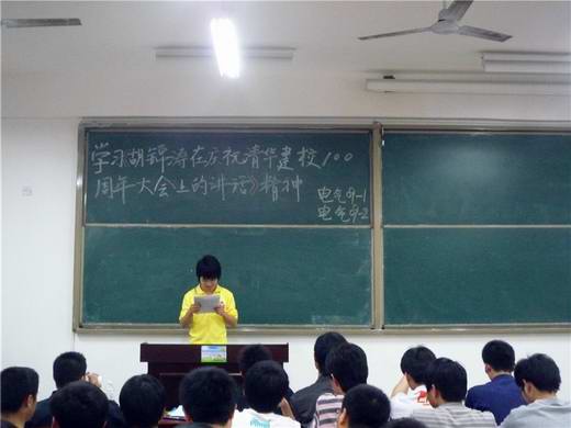 在4月24日上午举行的庆祝清华大学成立100周年大会上,中共中央总书记、国家主席、中央军委主席胡锦涛发表重要讲话,对清华大学的同学和全国青年学生提出了新的要求和希望。4月25日、26日,电气学院各专业班级纷纷召开主题班会、团支部会议,学习胡锦涛总书记在清华大学百年校庆大会上的讲话精神。