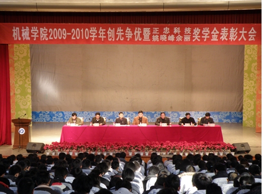 1月13日下午,机械学院在我校南校区小礼堂举行2009-2010学年“创先争优”暨“正忠科技”、“姚晓峰、余丽”奖学金表彰大会,对该院获得国家奖学金、优秀学生奖学金、“正忠科技”和“姚晓峰、余丽”奖学金的同学及荣获优秀研究生干部、十佳班长、十佳大学生、优秀学生干部、三好学生及标兵、先进班集体及标兵等荣誉称号的先进集体和个人进行了表彰。