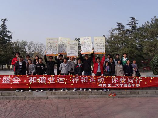 11月12日,测绘学院学生30余人在焦作市人民公园开展“传递理工祝福,喜迎祥和亚运”宣传活动。长长的条幅,做工精美的宣传板,激昂劲爆的《亚洲雄风》歌曲引来大批晨练的市民围观。“继1990年北京运会之后,时隔20年后,亚运会又回到了中国……” 测绘学院学生积极地为市民讲解有关与运会的知识。