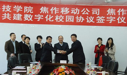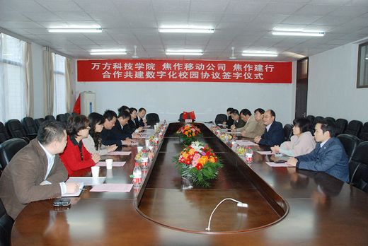 11月5日上午,万方学院在该院办公楼会议室举行数字化校园建设校企合作共建协议签字仪式。中国移动通信集团河南有限公司焦作分公司副总经理李哲、中国建设银行焦作分行副行长兼个人银行事业部总经理崔勇,万方学院党政领导王建中、郑伦仁、杨玉海参加签字仪式。仪式由万方学院党委副书记杨玉海主持。