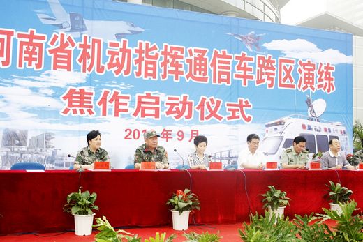 河南省庆祝人民防空60周年人防机动指挥通信车跨区(焦作)演练活动暨启动仪式在市人民广场隆重举行。本次机动指挥通信车跨区演练由河南省人民防空办公室、焦作市人民政府、焦作军分区主办,市人民防空办公室、中国人民解放军驻焦某部政治部、市文明办承办,省人防办副主任王乐新、市人大常委会副主任宫素清、市政协副主席周备锋、市人防办主任刘秋香、市政府办公室主任曹德义、焦作军分区参谋长董建亚等领导同志出席了此次仪式,我校计算机学院副院长高岩和后备军官学院主任吴敏飞带队参加。来自省人防办和郑州、焦作、洛阳、开封、安阳等地人防办的人防机动指挥通信车参加了此次演练。