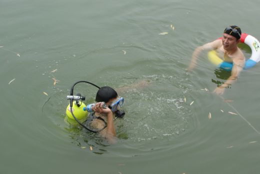 演练开始前,保卫处处长娄平仁进行了动员讲话,他要求全体参加演练人员要充分认识到这次活动的重要意义,自觉承担起溺水抢险救援的重大责任,要通过演练熟悉溺水救援预案,掌握组织应急救援时的组织指挥程序和方法,全面提高溺水抢险救援应急分队的快速反应和执行任务的能力。随后,进行了溺水救生、潜水、体能训练等三个科目的演练。由工作人员抛洒6个装满沙子的饮料瓶,5名救援队员潜入湖底进行打捞,短短的十几秒就打捞出4个。同时,2名救援人员穿潜水服戴氧气瓶潜入湖底进行打捞,顺利地将剩余2个打捞出来。最后,救援人员进行游泳体能训练。