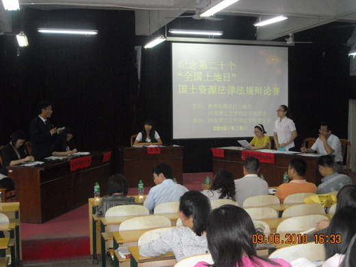 为纪念第二十个“全国土地日”,宣传国土资源法律法规,6月9日下午,政法学院与焦作高新区国土资源局联合举办国土资源法律法规辩论赛。高新区国土资源局副局长殷萍,政法学院党委副书记袁方等参与此次活动并担任评委。