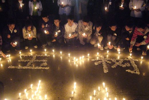 晚上6:40,材料学院院楼大厅内点点烛光燃起,组成一个“心”形图样,图样中间,朵朵白花摆成的“玉树”,支支蜡烛摆成“414”,同学们手捧蜡烛,胸戴白花,心中念着悼词,围绕烛光为玉树地震中的死难者默哀,为那些身处困境的同胞祈福。
