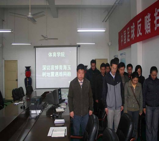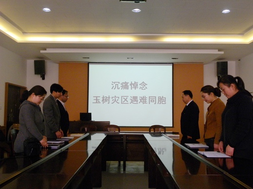 为表达对青海玉树地震遇难同胞的深切哀悼,4月21日上午10点,体育学院没课的教工在体育学院会议室为在玉树大地震中遇难者集体默哀三分钟,寄托对遇难者的哀思,共同为灾区的人民祈福,为抗震救灾的人员祈安。(体育学院 冯莉)