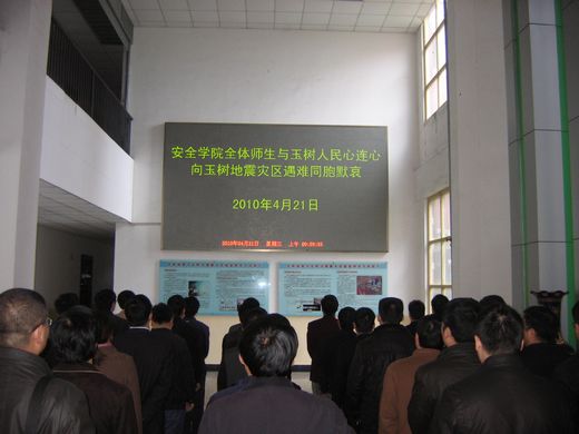 4月21日上午10点,安全学院教师为在玉树大地震中遇难者集体默哀三分钟,寄托对遇难者的哀思,共同为灾区的人民祈福,为抗震救灾的人员祈安。