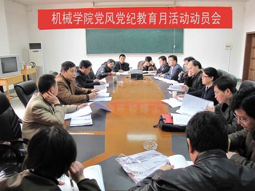 4月2日下午,机械学院召开党风党纪教育月活动动员大会,认真学习传达《中共河南理工大学纪律检查委员会关于开展党风党纪教育月活动的意见》文件精神,并对机械学院的党风党纪教育月活动进行了具体部署。 机械学院全体党政领导、各党支部书记和全体学生政工干部参加了会议。