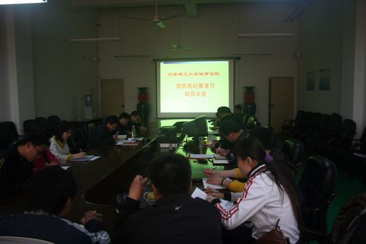 会上,马明传达并带领大家学习了《中共河南理工大学纪律检查委员会关于开展党风党纪教育月活动的意见》,并组织体育学院全体党员讨论了该学院2010年党风党纪教育月活动方案,号召体育学院全体党员要以身作则,认真学习党的纪律和方针,在全院教职工中起到模范带头作用。