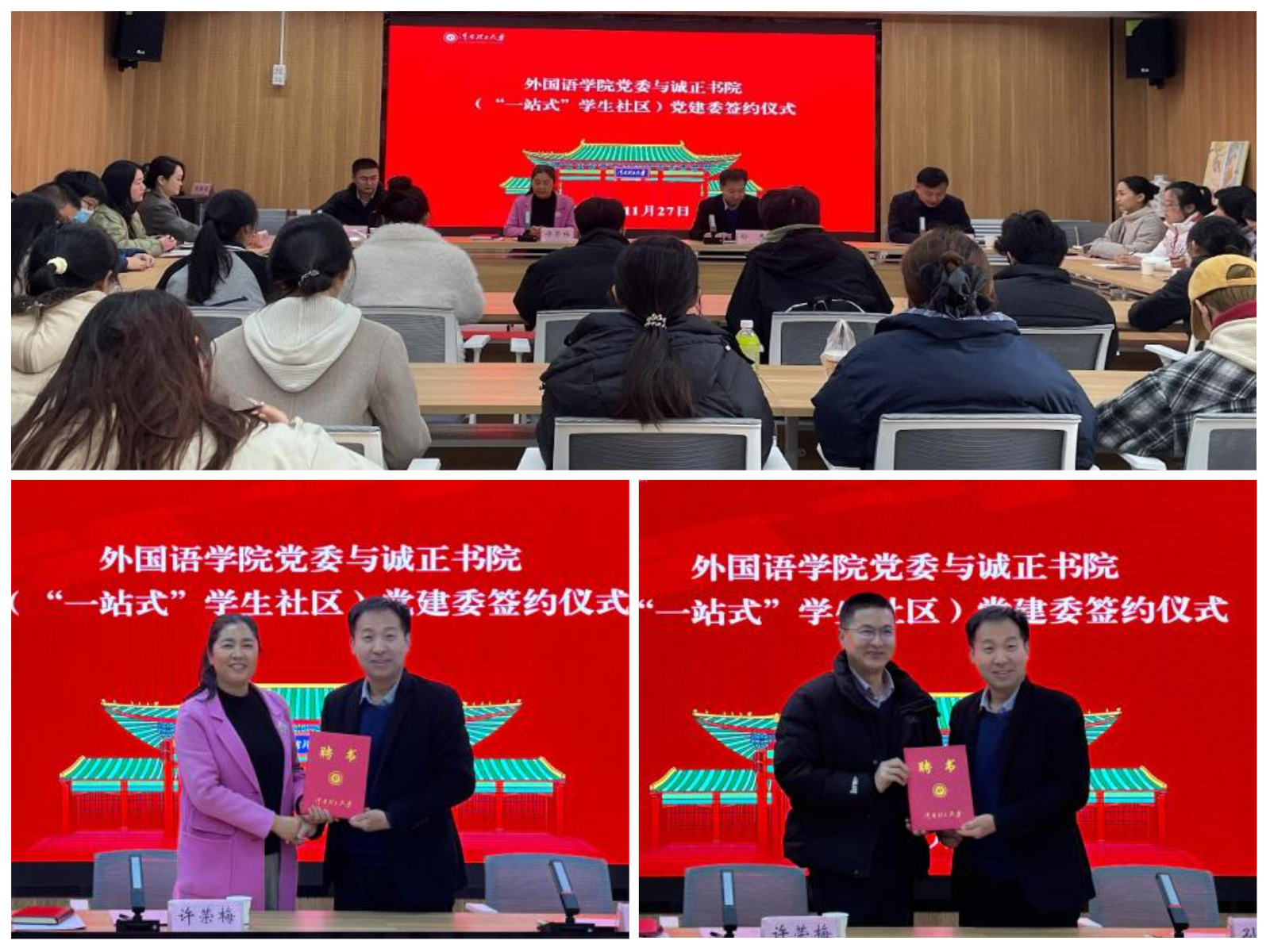 本网讯(通讯员 米丽娜)为深入推进学校“一站式”学生社区综合管理模式建设,11月27日上午,外国语学院党委与诚正书院(“一站式”学生社区)党建委举行协同育人合作签约仪式。双方相关负责人、育人导师和学生代表参加仪式。