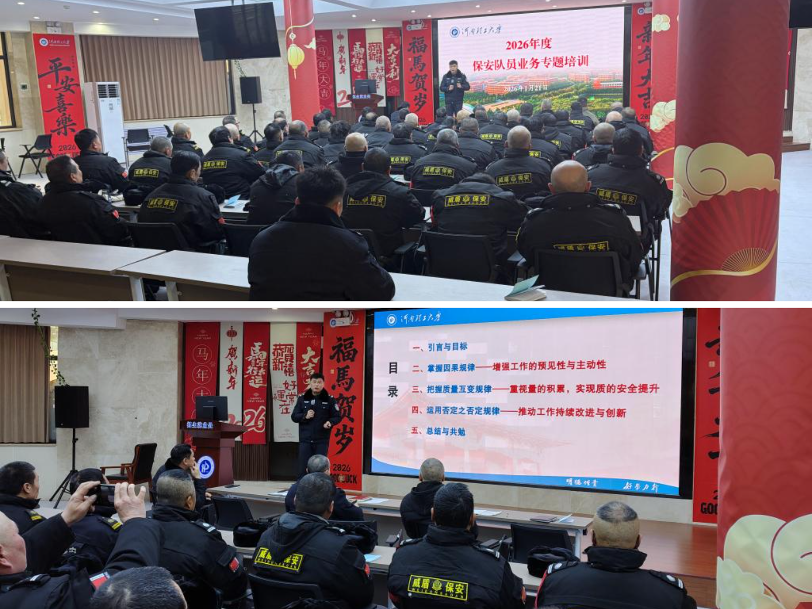本网讯(通讯员 张勐) 为全面提升校园安全保卫工作水平,增强安保队伍的风险防范与应急处置能力,1月21日,保卫处在南校区大学生活动中心一楼招聘大厅开展了2026年度安全保卫工作业务专题培训。保卫处校卫队负责同志、南北校区安保骨干和队员共计60余人参加了本次培训。