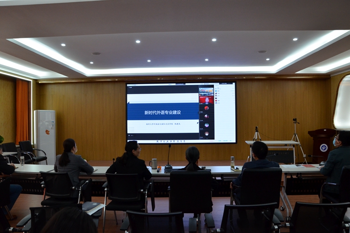本网讯(通讯员 曹旺儒)4月5日,郑州大学外国语与国际关系学院院长、教授钱建成,通过腾讯会议作了题为《新时代外语专业建设》的学术报告。讲座由我校外国语学院院长李惠敏主持,该院领导班子及英语系、日语系全体教师共同听取了此次报告。
