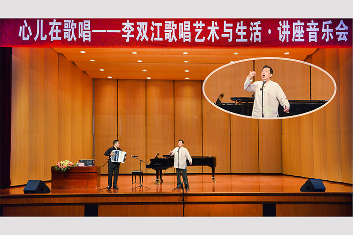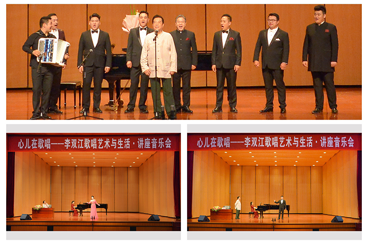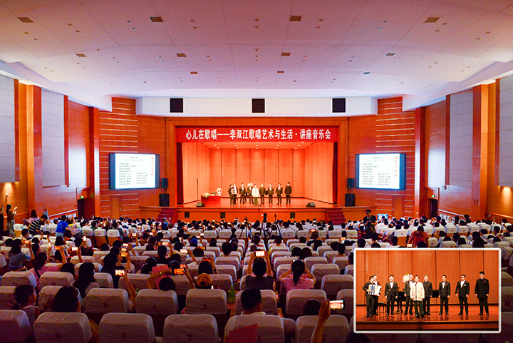 本网讯(通讯员 张曼/文 王红涛/图)7月6日晚,“心儿在歌唱”李双江歌唱艺术与生活讲座音乐会在我校南校区明德楼音乐厅举行。校工会主席郭相春出席,学校相关职能部门、音乐学院相关负责人,全校600余名学生共同欣赏了本次音乐会。此次讲座音乐会由音乐学院院长李新现主持。