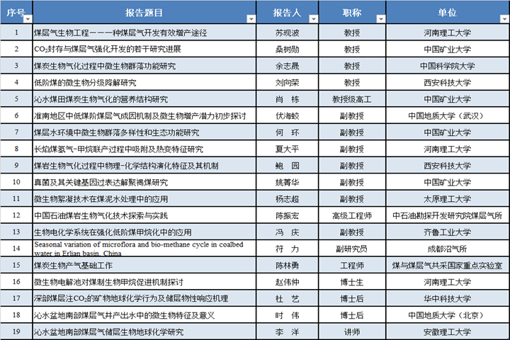 会议邀请相关专家围绕“煤层气生物工程理论与技术”会议主题,作高效产甲烷菌群的培育、产气机制及强化技术、煤层气生物工程增产关键技术及应用、采空区微生物采残煤与二氧化碳埋存技术、高硫煤微生物脱硫及硫化氢资源化利用、褐煤的微生物提质与梯级利用等方面的学术报告,报告题目如下: