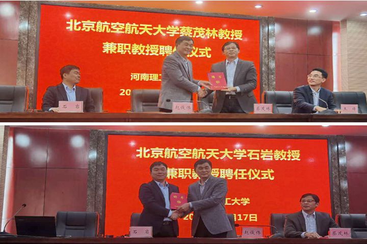 本网讯(通讯员 张业明)10月17日下午,北京航空航天大学教授蔡茂林、石岩受聘为我校兼职教授,授聘仪式暨学术报告会在我校机械学院学术报告厅205举行。副校长赵俊伟出席会议,机械学院相关领导及部分师生参加了会议。受聘仪式和报告会由该院副院长焦锋主持。