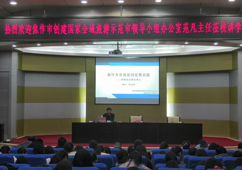 11月21日晚,应我校工商学院邀请,焦作市创建全域旅游示范市领导小组办公室主任范凡在力行楼学术报告厅作了题为《焦作市全域旅游发展实践报告》的报告。该院旅游管理系全体教师和学生参加,报告会由该院副院长傅端香主持。