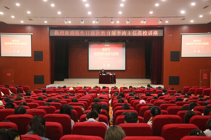 11月5日,应文法学院邀请,焦作日报社教育部主任李涛在北校区小礼堂作题为《新时代新闻写作实务与前瞻》的学术报告。报告由学院党委副书记李旭升主持,学院全体中文和广告专业学生共同聆听报告。