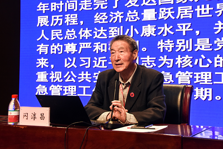 会上,闪淳昌就“中国特色的应急管理事业”“应急管理面临的新挑战”和“推进新时代应急管理工作”三个方面进行了详细阐述。他结合时代背景、融合自身经历,分享了中国特色应急管理的主要经验。他指出,要始终把保护人民财产安全,维护国家安全、公共安全和社会稳定作为应急管理的初衷,坚持以人为本,依靠法治,依靠科学,依靠群众。闪淳昌通过准确的数据分析和鲜活的案例讲解,指出我国应急管理目前面临着“自然灾害的突发性、异常性和复杂性增加”“我国是高风险的城市,低设防的农村”“新时期突发事件呈现新特点”等6项新挑战。他强调,面对挑战,我们应树立新时期应急管理的新理念、构建新时代社会治理体制、把防风险摆在突出位置、全面建设应急管理法律制度体系、依靠科技进步,做好应急准备、加强优化统筹国家应急能力建设。他表示,在以习近平同志为核心的党中央领导下,坚持习近平新时代中国特色社会主义思想,中国特色的应急管理体系建设和公共安全事业一定能够不断地向前进!同时,闪淳昌就应急管理学院师生教学内容、研究方向等提出指导性意见建议。