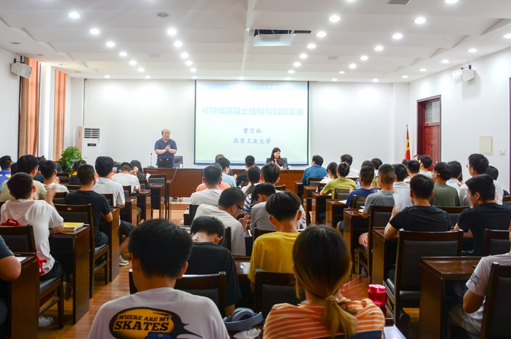6月4日下午,曹万林在土木学院一楼学术报告厅作了题为《可持续混凝土结构和创新发展》的学术报告。报告会由土木学院院长丁亚红主持,该院相关专业100余名师生共同聆听了报告。报告会上,曹万林从可持续混凝土结构、实践是创新的根基两大部分展开报告,并围绕研究背景与关键问题、再生混凝土材料、再生混凝土结构、再生混凝土组合结构、近期研究与思考等五个方面进行了详细阐述。曹万林重点对再生混凝土结构设计理论与方法进行了介绍,他结合自身多年的研究经验以及团队实验研究的经历,通过实验数据和实践成果的展示,分析总结了再生混凝土在各类结构中的应用情况,并对再生混凝土与普通混凝土在抗震、抗火、抗冻融、抗氯侵蚀等性能上的差异进行了分析,对研究生的提问进行了耐心的解答。曹教授语言挚朴,讲解深入浅出,展现了严谨的科研作风,流露出对青年教师和研究生学子在科研领域的殷殷期望。