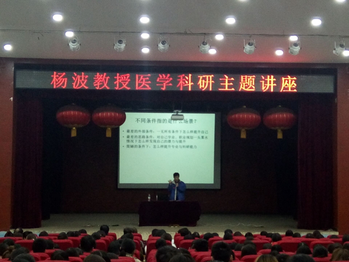 为了更好地贯彻习近平总书记在全国高校思政工作会议上的讲话精神,突出党建工作的方向引领,找准党建工作与业务工作的结合点,12月18日,应我校医学院邀请,郑州大学第一附属医院教授杨波在我校北校区小礼堂作题为《不同条件下专业与科研能力的跨越式提升探讨》的学术讲座。该院全体教师及学生代表聆听了讲座。