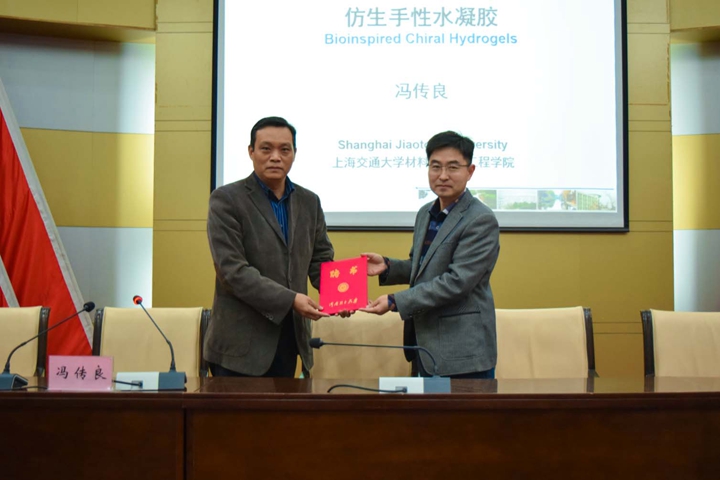 11月6日下午,应我校材料科学与工程学院邀请,上海交通大学教授冯传良在我校学术报告厅作题为《仿生手性水凝胶》的学术讲座。该院副院长朱建平为冯传良颁发兼职教授聘书。该院近200名师生参加了此次报告会。