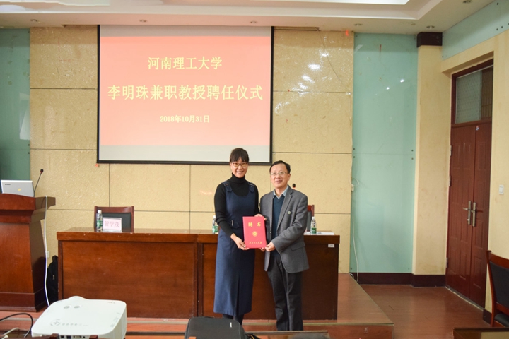 10月31日下午,中国科学院化学研究所研究员李明珠受聘我校兼职教授仪式暨学术讲座在材料学院1203会议室举行。该院院长管学茂为李明珠颁发兼职教授聘书,材料学院相关专业100余名师生共同聆听了讲座。