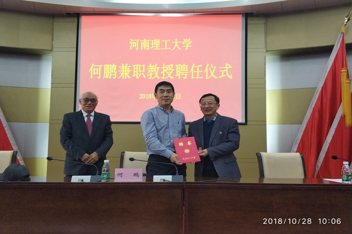 10月28日上午,哈尔滨工业大学教授何鹏受聘我校兼职教授仪式暨学术报告会在我校力行楼学术报告厅举行。报告会由我校牛济泰院士主持,材料学院院长管学茂为何鹏颁发兼职教授聘书,材料学院材控专业200余名师生共同聆听了报告会。